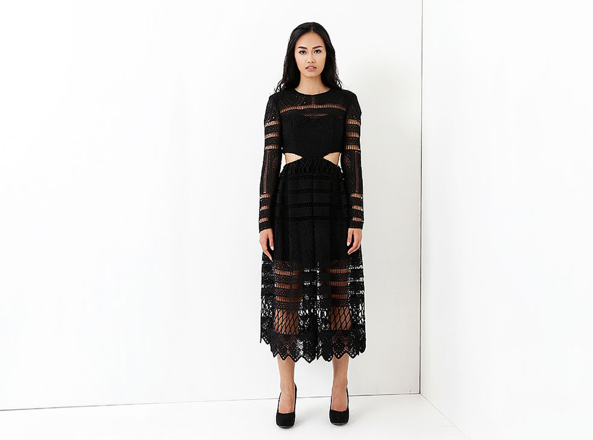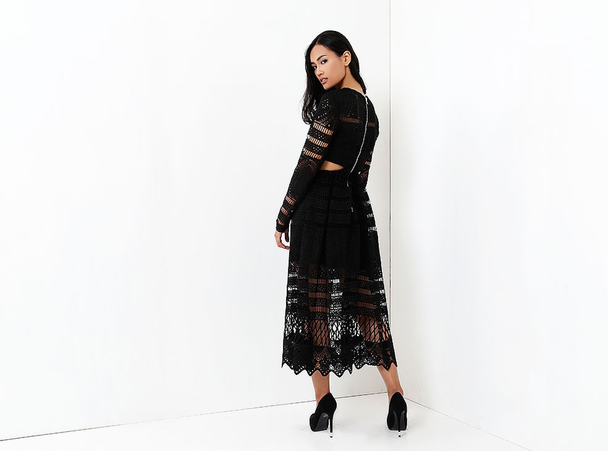 • The dress hemline is scalloped with the geometric design of the lace and finishes at mid-calf.