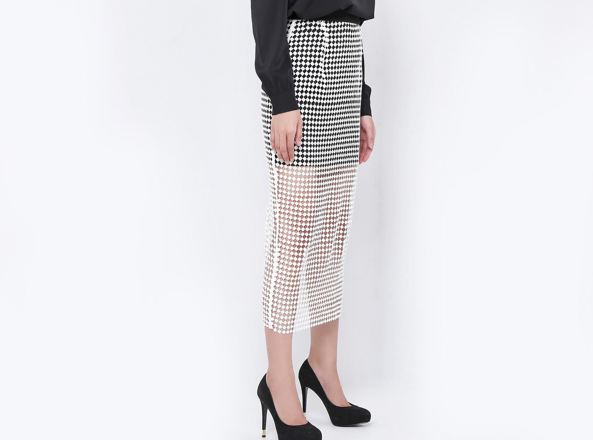 • A midi length circle lace skirt, with a black contrast waistband and black mini skirt lining.