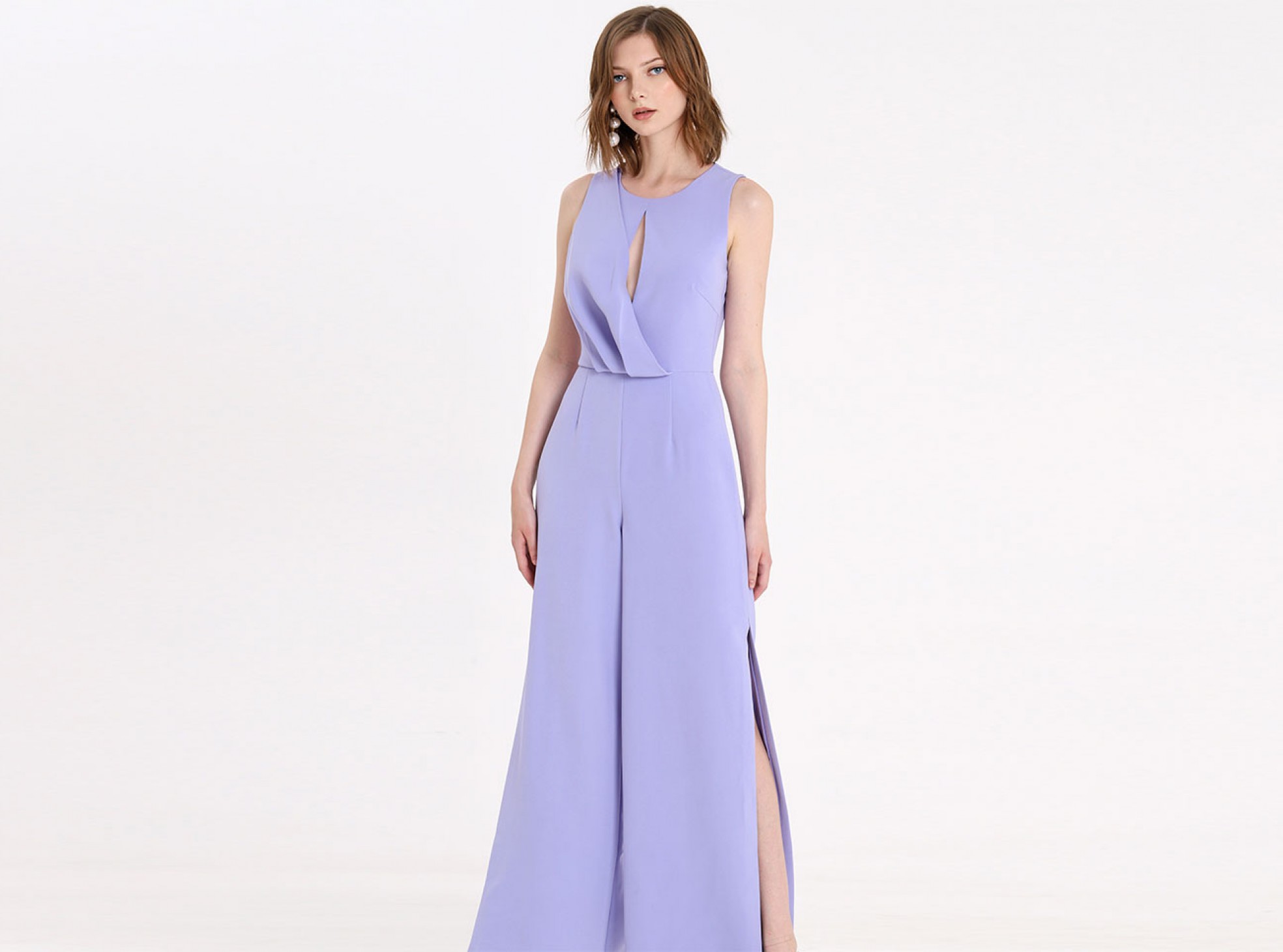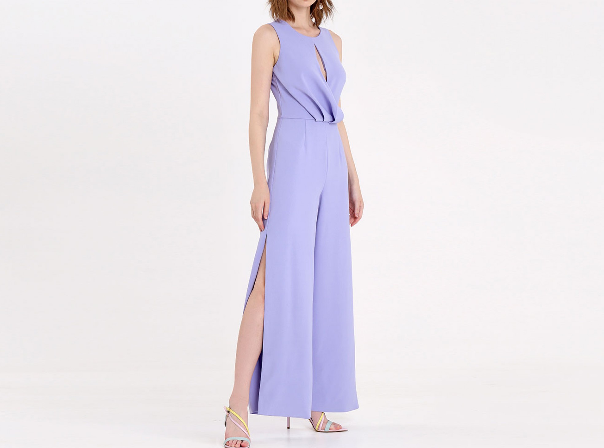 Keep it easy breezy with the draped split leg jumpsuit in summertime lavender. What could be deemed as a more conservative style is amped up with the subtle flirtation of the full split trouser leg; meaning this look will be just as at home at a family BBQ as it will on the tiles. With the keyhole neckline adding in another nuance of interest, you can keep accessories on the DL here.