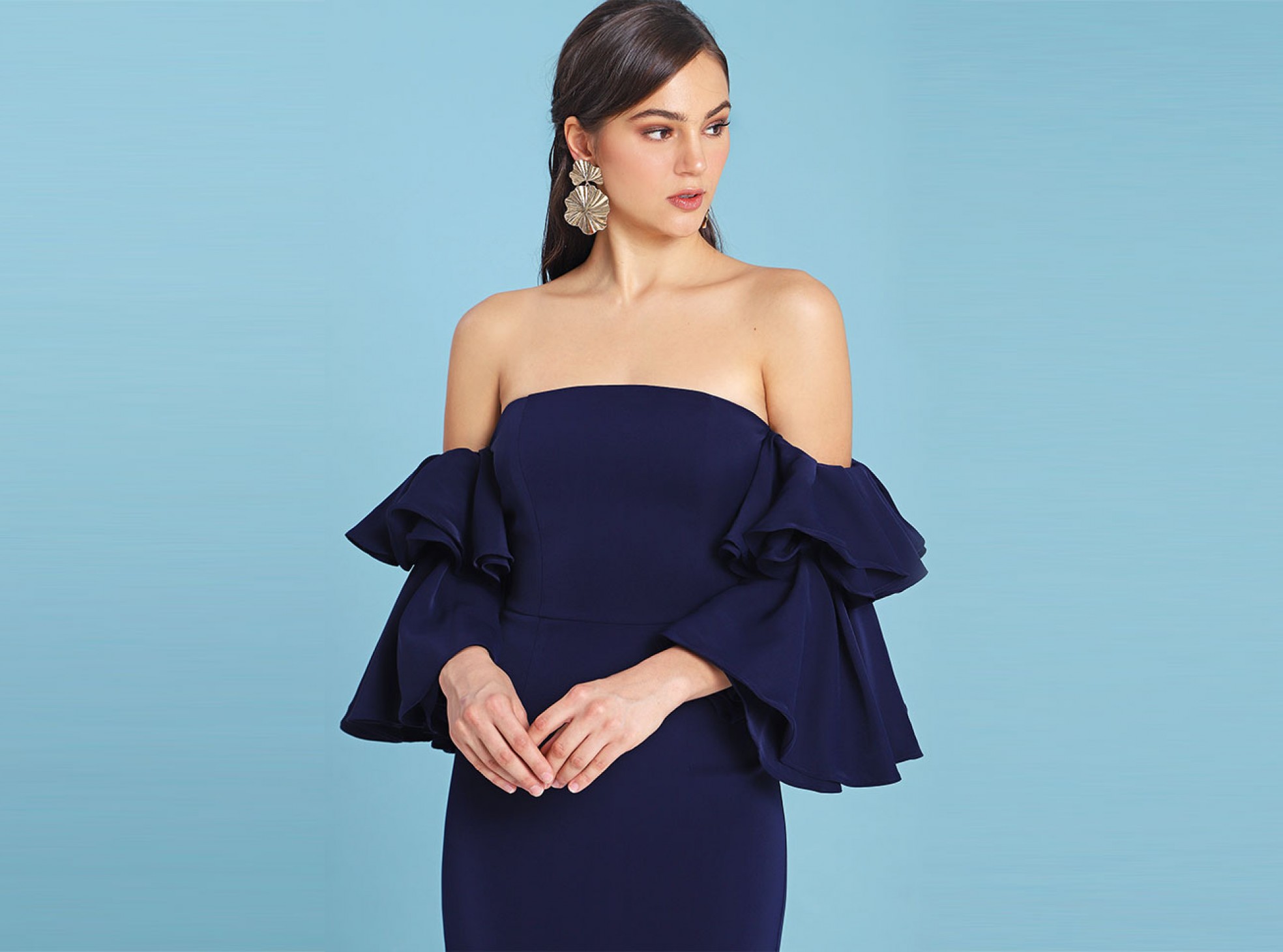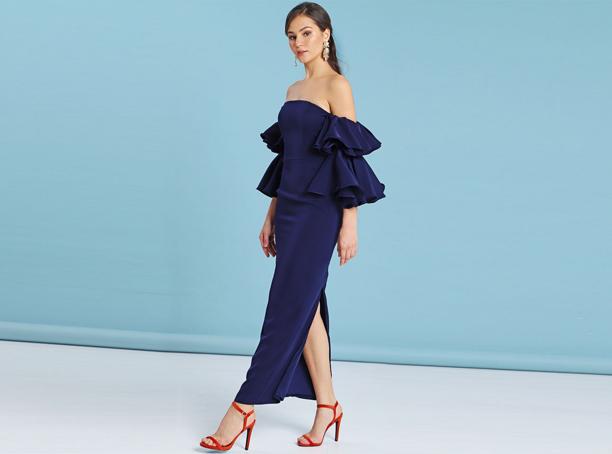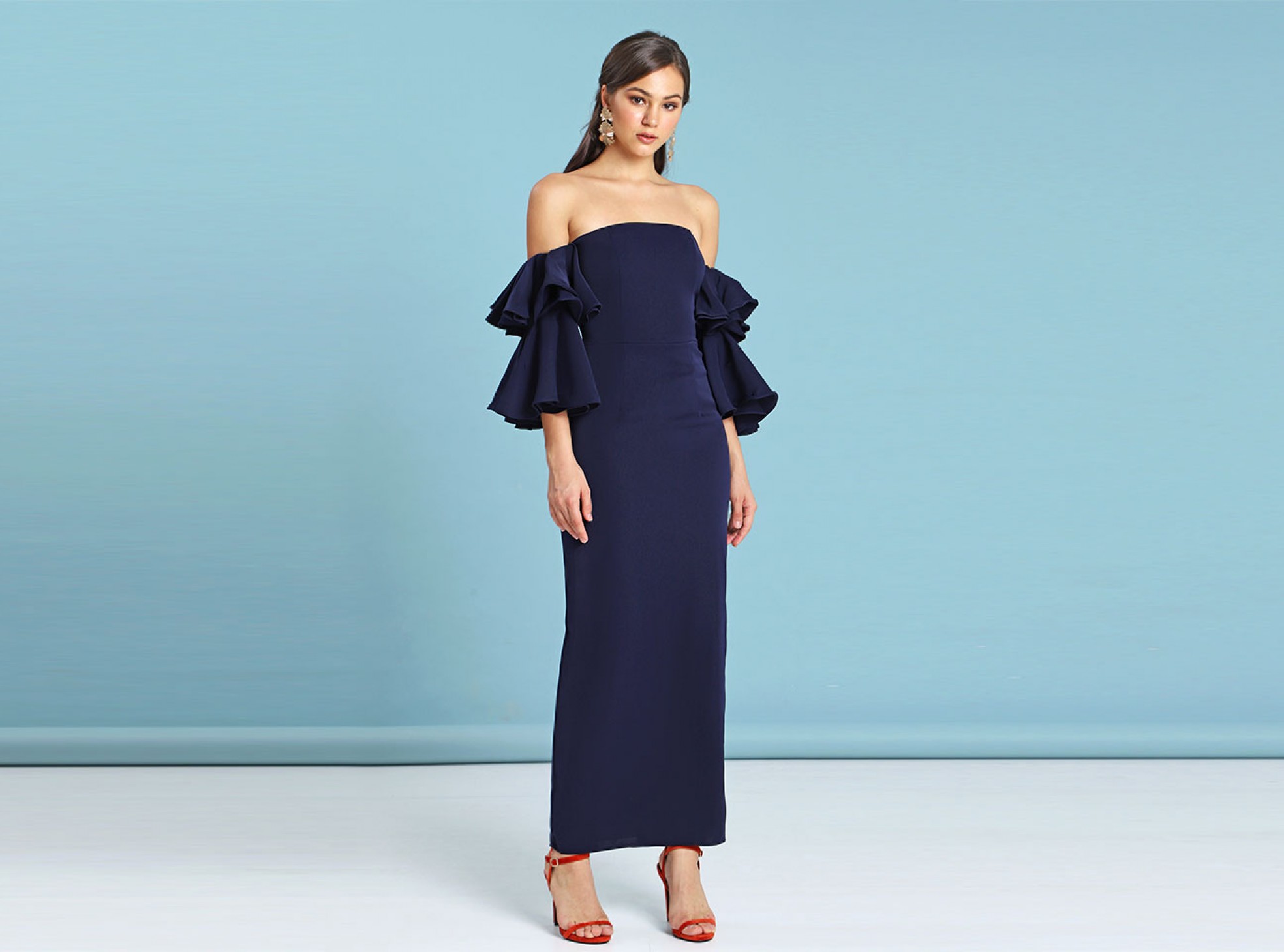 EXAGGERATED FRILL SLEEVE MAXI DRESS IN NAVY