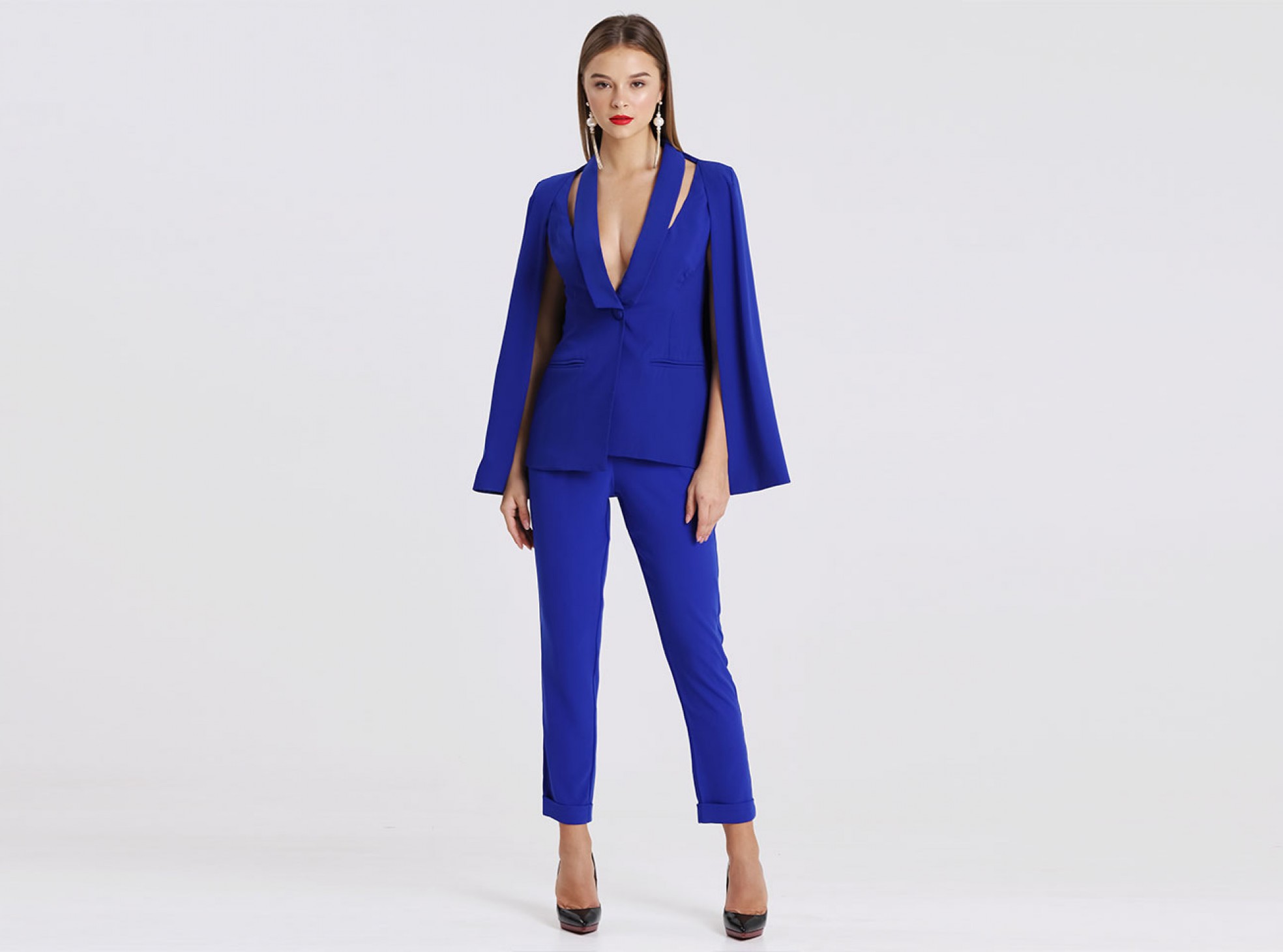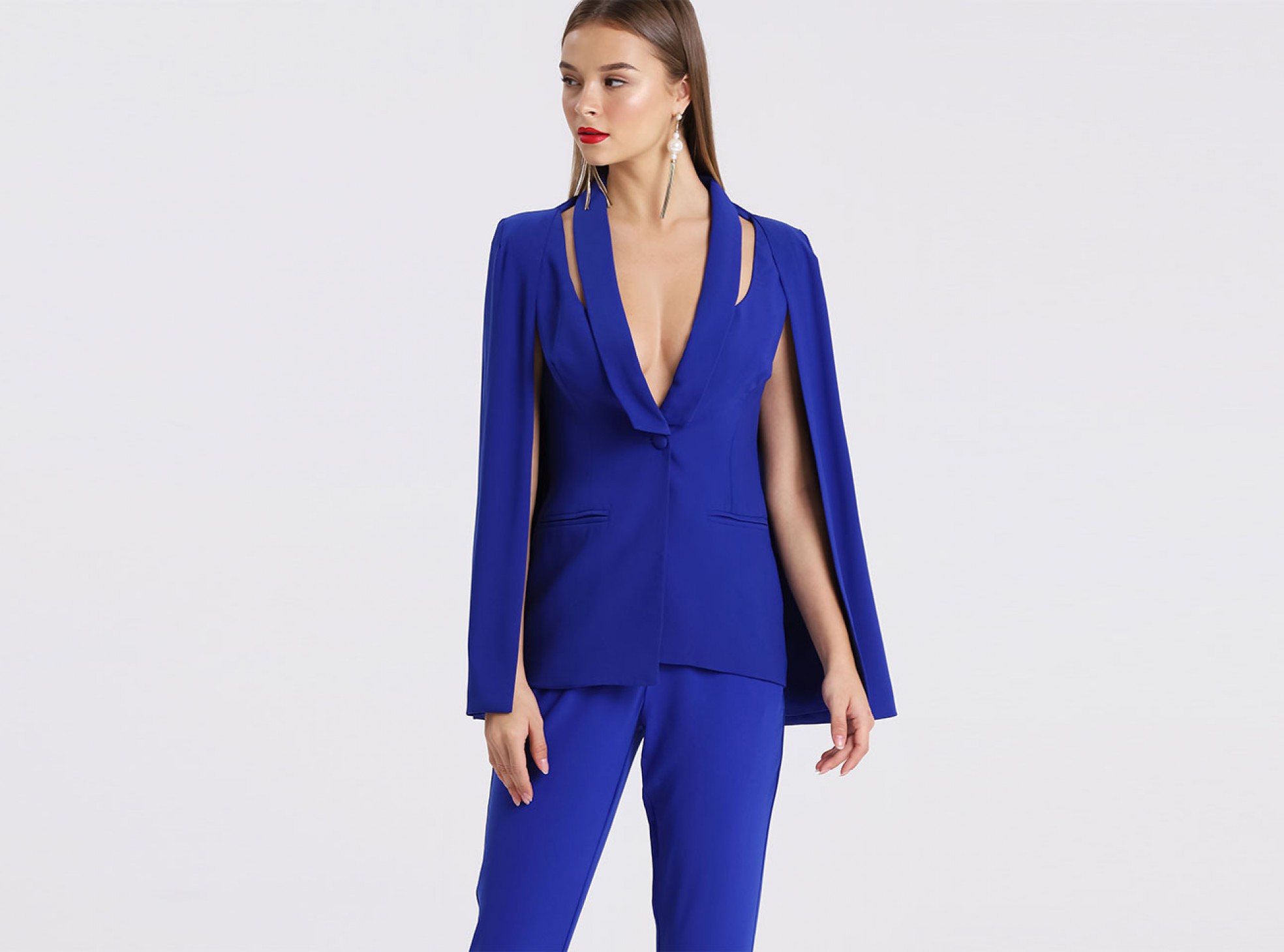 Our signature cape style is reworked for the new season in vibrant cobalt blue. With cut out lapel detailing, padded button closure and tuxedo paneling this piece is a returning favourite. A relaxed fitting back allows for a structured and tailored front, with a hint of stretch for added movement. Pair with the coordinating trousers for the full effect.