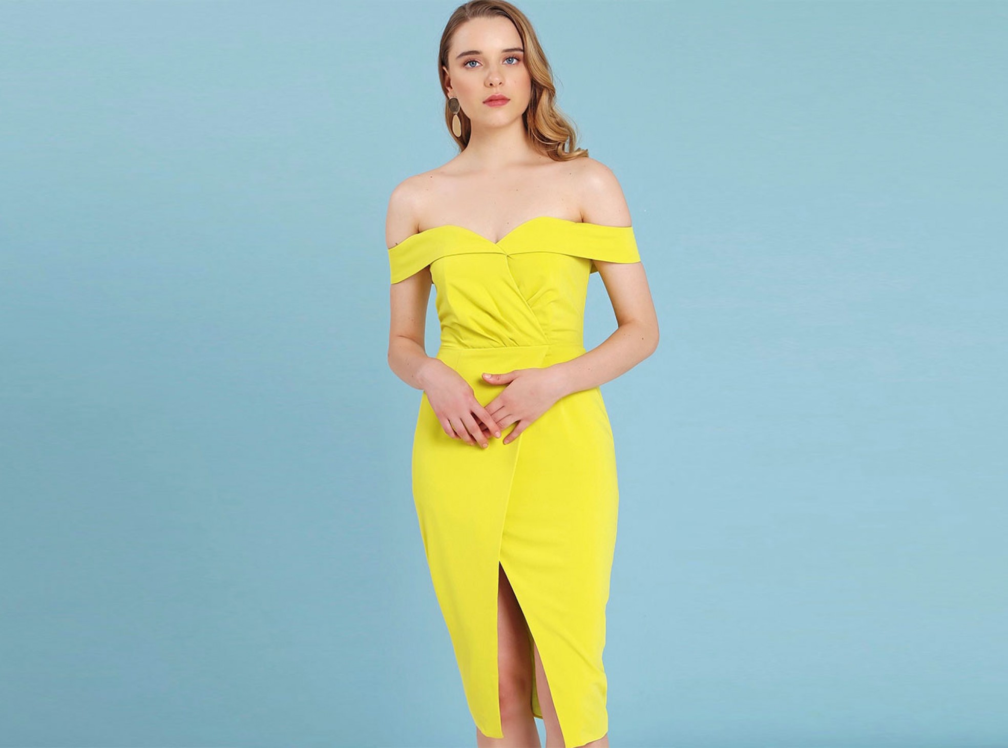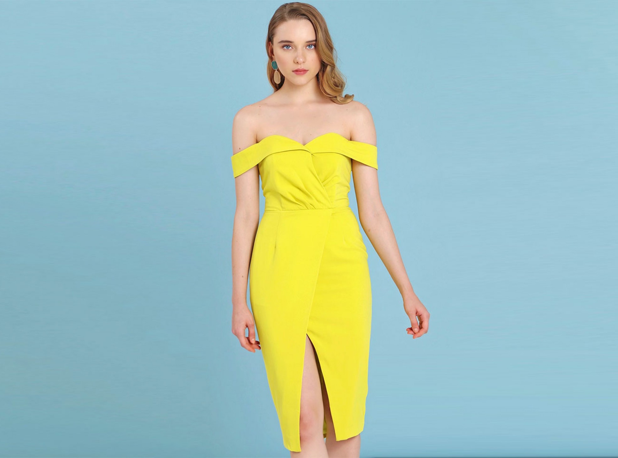 Pleated Bardot Wrap Midi Dress in Acid Yellow