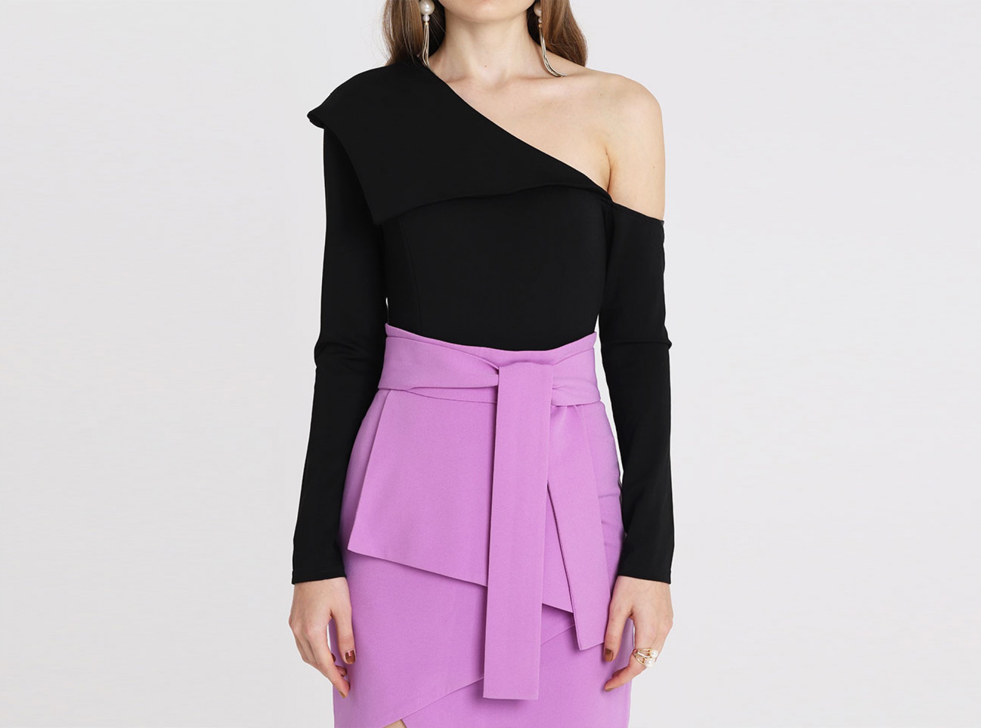Panelling is the ultimate oxymoron - the classic way to instantly add a sense of modernity to your outfit - and what better way to do it than in this shoulder fold over bodysuit presented in versatile jet black. The off-the-shoulder cut frames the d̩colletage, whilst the power shoulder forms a strong silhouette. Team with culottes or a midi skirt for a suitable play on professional dressing.