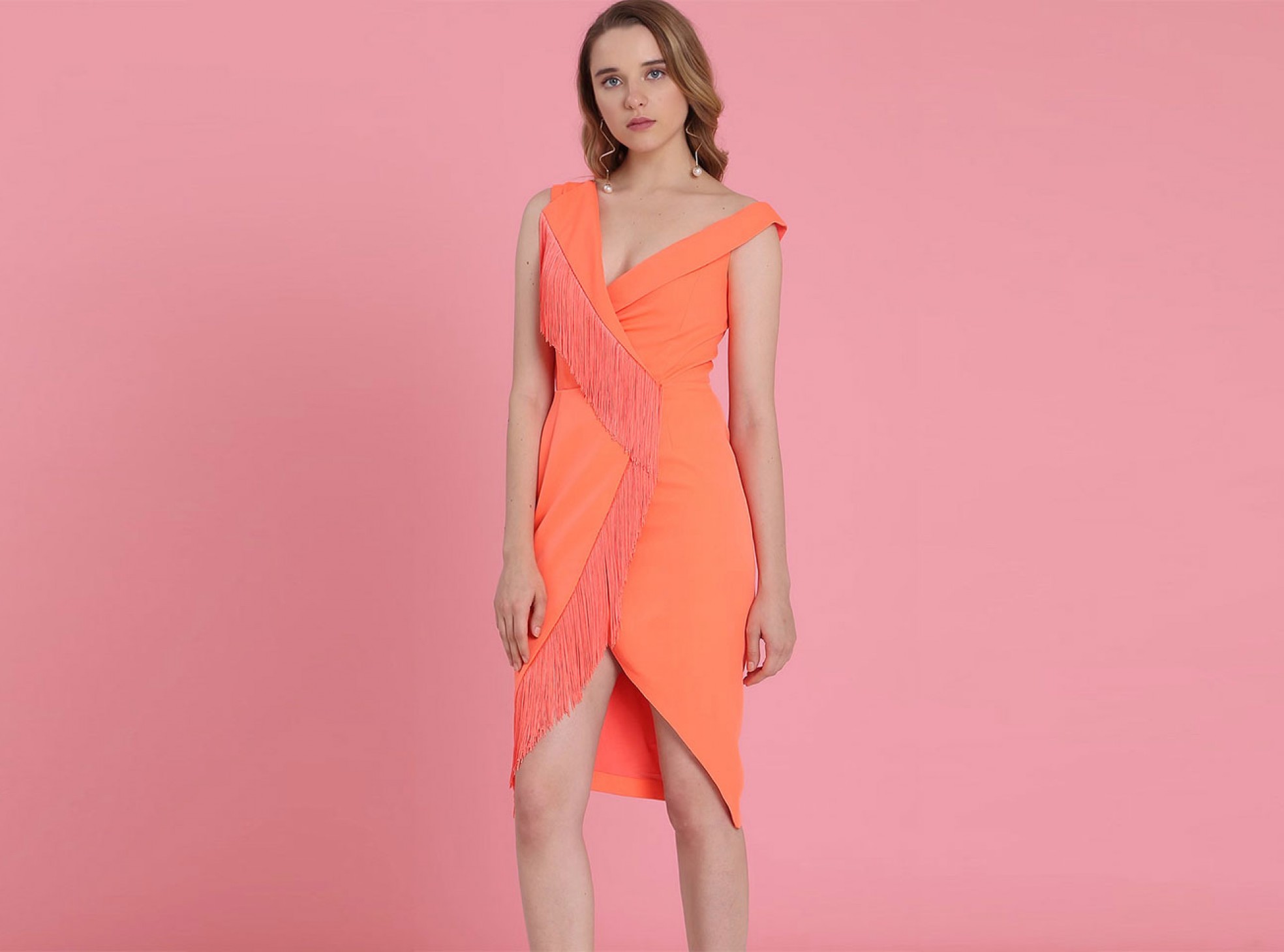 Get ready to party in our oh so fun wrap midi dress with hemline tassels. In a vibrant neon coral and sultry off the shoulder, this piece is made for summer evenings!